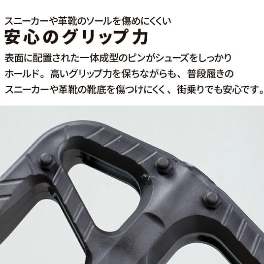 表面に配置された一体成型のピンがシューズをしっかりホールドし、高いグリップ力を保ちながらも、普段履きのスニーカーや革靴の靴底を傷つけにくく、街乗りでも安心です。