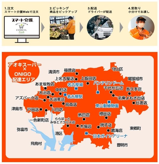 株式会社アオキスーパー(以下「アオキスーパー」)は、多様化するお客様のライフスタイルに対応する為、2023年よりONIGO株式会社(以下「ONIGO」)が展開する即時配達サービス(Qコマース)を導入し、現在、名古屋市内全16区に加え、津島市、清須市、大治町、あま市、蟹江町、瀬戸市、豊明市、春日井市、尾張旭市、長久手市、日進市にまで配達エリアを拡大しています。