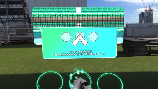 1:青い目印に手を入れてレシーブ対戦が始まると、スパイクが飛んでくる可能性のある位置に青いボールの目印が表示されます。両手を目印に合わせ、そこにスパイクが飛んでくればレシーブ成功です。