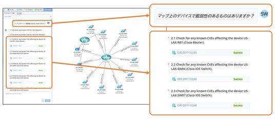 チャットボックスから自然言語により「マップ内のデバイスにCVE脆弱性はありますか」「アプリケーションの動作が遅い原因を特定してください」といったトラブルシューティングのための質問をすることで、数万件もの自動化された解析データのなかから、質問の文脈を読取った解析結果やアクションプランを受取り、誰もが問題解決を効率化できます。これまでの煩雑なトラブルシューティングプロセスに代わり、AIを活用したアクションプランにより、ネットワーク運用チームは技術的な問題に煩わされることがなくなります。
