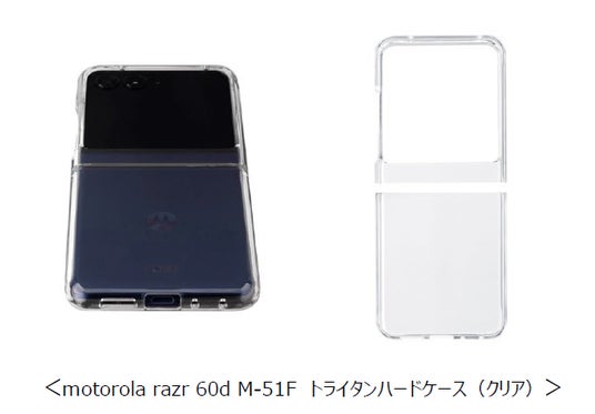 「motorola razr 60d M-51F」の発売に併せ、トライタンハードケースを発売します。ガラスのような美しい光沢と透明度を持ち、耐久性の高い素材TritanTMRENEW を使用しております。ケースの薄さと端末を保護する強度を兼ね備えたケースです。