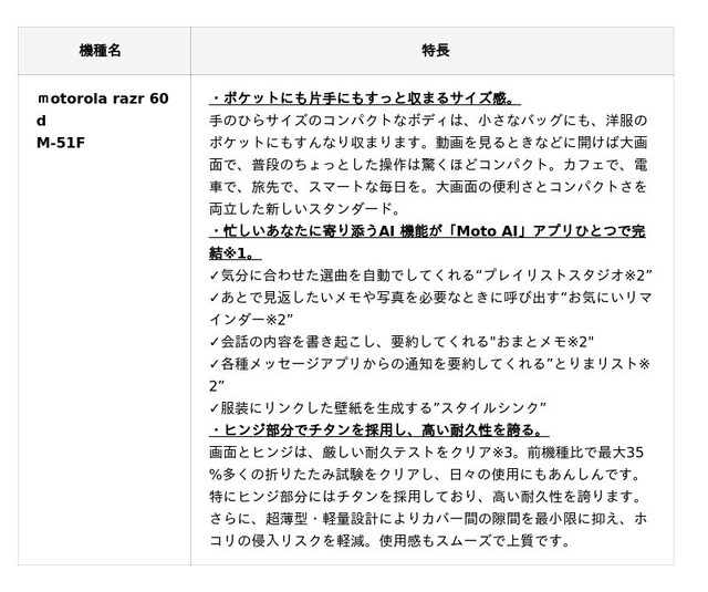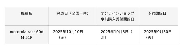 なお、「motorola razr 60d M-51F」の発売に併せたキャンペーンを2025年10月10日(金曜)から2025年11月30日(日曜)までの期間で開催いたします。キャンペーンの詳細は別紙をご確認ください。