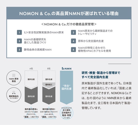 NOMON & Co.株式会社(本社:東京都千代田区、代表取締役:安藤進ノ介)は、「プロダクティブ・エイジングがあたりまえの社会を創る」というビジョンの実現に向け、ヘルスケアブランド「NOMON(ノモン)」を再始動することをお知らせします。ブランド再始動にあたり、その第一弾製品として、科学的知見に基づき開発したNMNサプリメント「&NMN」「&NMN HIGH PERFORMER」を、本日より公式オンラインストアにて発売開始します。
