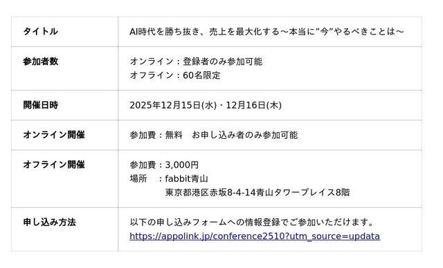 参加申し込みはこちら:https://appolink.jp/conference2510?utm_source=updata
