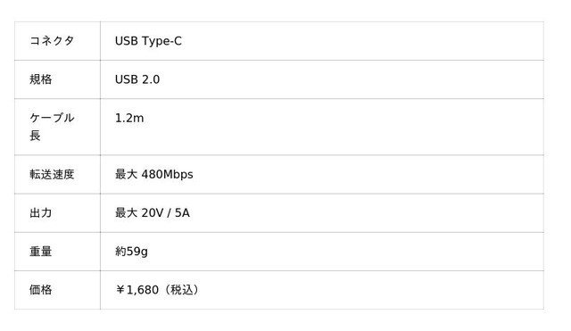 1本で2台同時充電2つのUSB Type-C端子を搭載し、スマートフォン、タブレット、ノートPCなどを同時に充電可能。