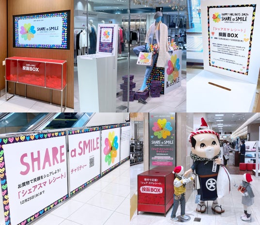 「SHARE a SMILE(お買物で笑顔をシェアしよう!)」というメッセージを掲げ、地域の子供たち、お客様、支援団体の一人ひとりを笑顔にするための支援を目的とした寄付活動を、24年11月~12月のホリデー期間、対象9店舗で初開催しました。期間中、対象売場にてお買い上げごとに発行する1枚の「シェアスマ レシート」を設置のBOXに投函いただくことで、レシート1枚につき50円を大丸松坂屋百貨店が寄付先に寄付しました。お客様のご協力により、総額3,725,800円を寄付いたしました。25年度も11月~12月に開催予定となります。