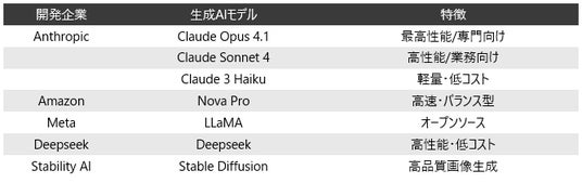 既存の3つのAIモデル(Claude Sonnet 4、Nova Pro、Claude 3 Haiku)に加え、新たにClaude Opus 4.1、Llama、Deepseek、Stable diffusionの計7つのモデルから選択が可能となりました。