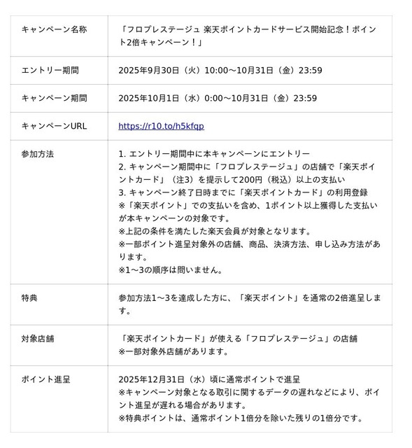 本導入を記念して、2025年10月1日(水)から10月31日(金)まで、「フロプレステージュ 楽天ポイントカードサービス開始記念!ポイント2倍キャンペーン!」を実施します。