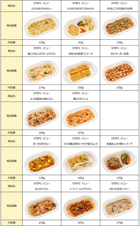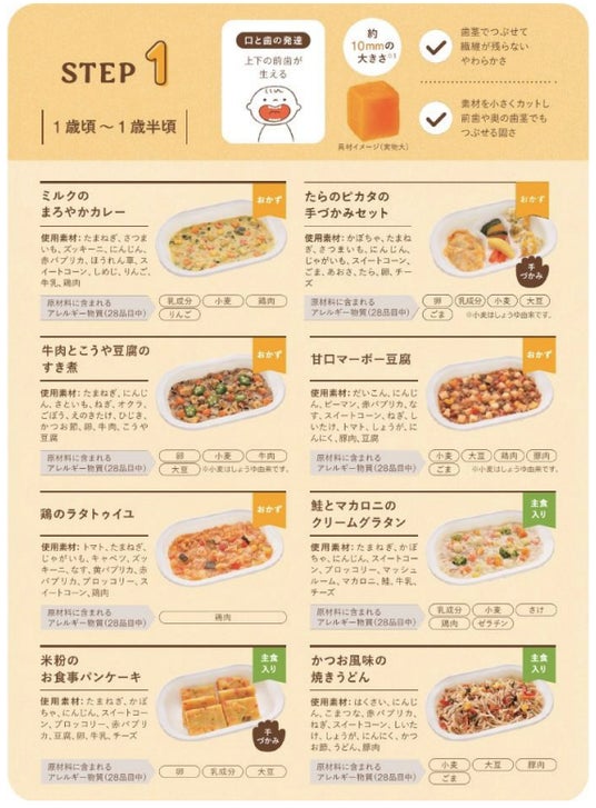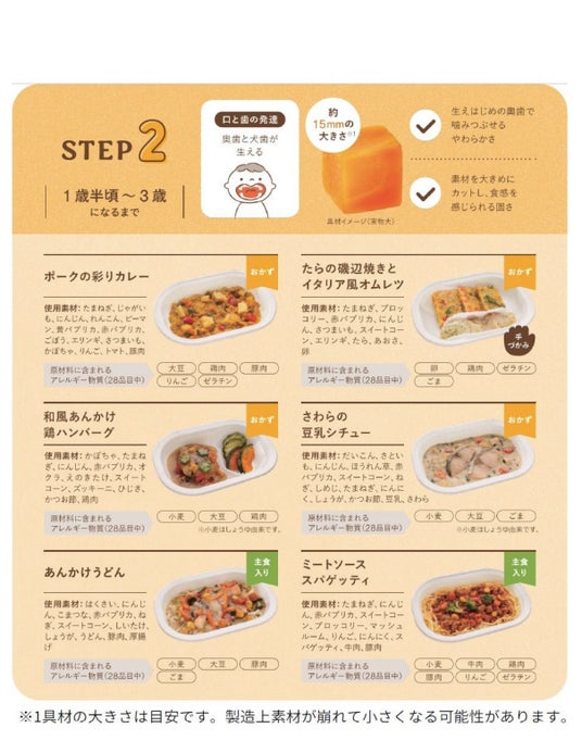 1食で10種類以上、全メニューを通じて50種類の素材を体験できる、彩りゆたかな冷凍幼児食です。お子さまの噛む力に配慮し、発育に合わせた固さ・大きさの素材を使用しているため、しっかりと噛んで食べることができます。現在、1歳から1歳半頃までの「STEP1」メニューは全8種類、1歳半頃から3歳になるまでの「STEP2」メニューは全6種類を展開しており、今後もラインアップを順次拡大していく予定です。お子さまの月齢や味の好みに合わせてメニューをカスタマイズできる、定期宅配型の冷凍幼児食サービスとして日々のお子さまの食事をサポートします。