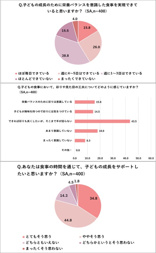 1~3歳児を持つ共働き家庭で、子どもの食事作りに関与している男女各200名を対象に当社が実施した「親子の食卓の実態調査」によると、子どもの食事で大切にしたい要素として「栄養バランス」の回答割合が74.5%と最も高い結果となりました。一方で子どもの成長のために栄養バランスを意識した食事を”ほぼ毎日”実現できている人は、わずか15.8%にとどまりました。また、彩りについて「できれば彩りも良くしたいが、そこまで手が回らない」と43.5%の人が回答しました。