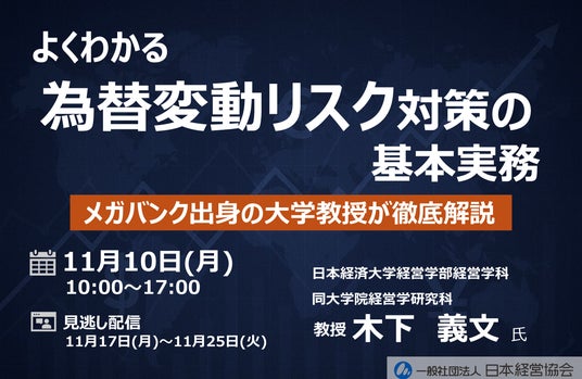 一般社団法人日本経営協会(本部事務局:東京都渋谷区、会長:高原 豪久)は、2025年11月10日(月)にオンラインセミナー「よくわかる為替変動リスク対策の基礎実務」を開催いたします。