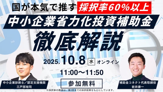 補助金コネクト株式会社(本社:東京都渋谷区、代表取締役:岩井康一)は、省力化投資補助金の基本から最新の採択傾向、実際の申請支援事例までを分かりやすく解説する無料オンラインセミナーを開催します。補助金活用を検討中の経営者さまに、経営に直結する情報をお届けします。