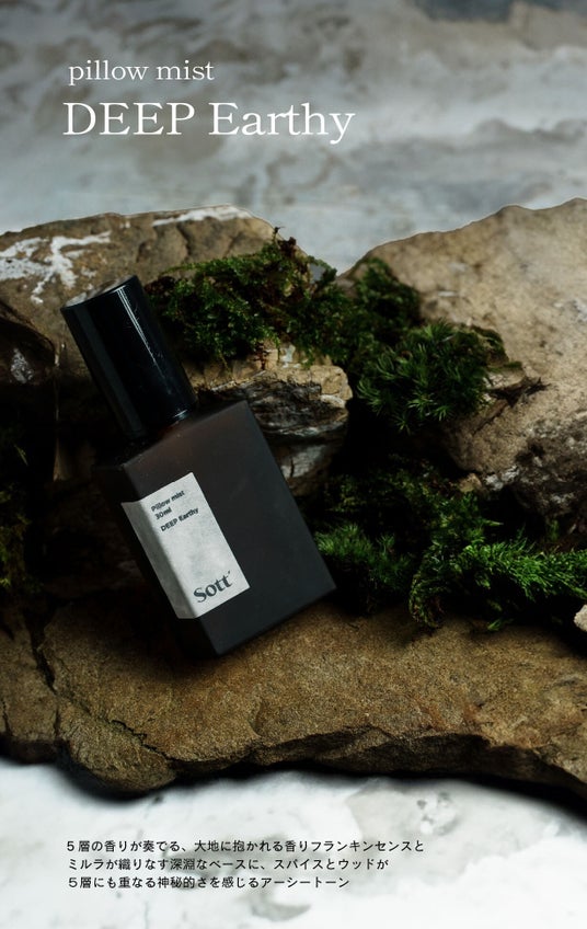 ブランド第一弾となるプロダクトは、100%天然由来成分にこだわって開発した「ピローミスト」。2種類の香りのラインナップをご用意しました。人工的に作られた香りではなく、自然をぎゅっと濃縮させたような、軽すぎず、重すぎず、身体にすっと入り込んでくれる自然本来の香りで睡眠をデザインします。■5層の香りが奏でる、大地の香り──「DEEP Earthy」