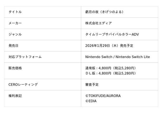 株式会社エディア(本社:東京都千代田区、代表取締役社長:賀島 義成、以下:エディア)は、Nintendo Switch向けタイムリープサバイバルホラーADVゲーム『虧月の夜』のパッケージ版を本日2025年9月30日(火)より予約受付を開始したことをお知らせいたします。