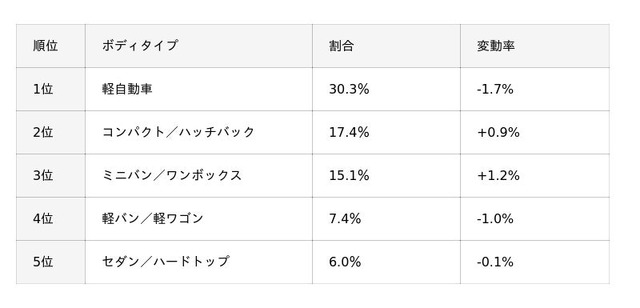 国産車のボディタイプ別ランキングでは、軽自動車が変わらず1位を維持しています。8月は軽自動車が少しシェアを落としているものの、大きな変動は見られませんでした。