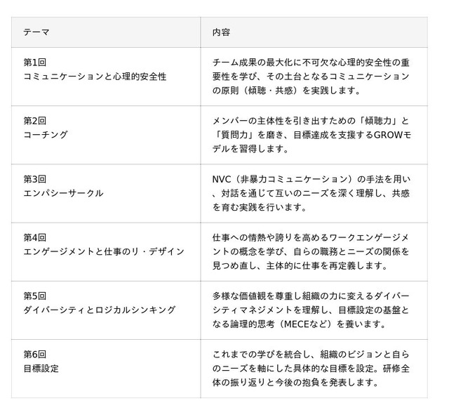 当社は、「日本のDXをあるべき姿にしていく」というミッションの実現に向け、事業を拡大しております。この成長を継続的なものとするためには、次代を担うリーダーの育成が不可欠です。そこでこの度、社員が自ら主体的に目標を設定し、課題解決に向けて行動できる「自律型人財」を育成するための新プログラムを開始いたしました。本研修は、単なるスキル習得に留まらず、周囲と良好な関係を築きながらリーダーシップを発揮できる人財を輩出することを目的としています。