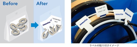 建設機械・鉱山機械で世界トップクラスのシェアを誇るコマツは、その中核生産拠点の一つである小山工場において、主にエンジンや油圧機器・アクスルなどの重要部品を生産しています。グローバル市場への製品供給においては、製品ひとつひとつのトレーサビリティや輸出入時の正確な管理が求められる中、一つのパッケージにまとめられた修理用部品(セット品)の構成品である小径のOリングやガスケットといった部品についても、個別に管理ラベルを貼付する必要性が高まっていました。従来は複数部品をまとめて袋詰めし、共通の部品明細リストのみを添付して出荷していましたが、輸出時の税関対応や修理用セット品管理の高度化に伴い、単品ごとに明細識別が求められるラベルの活用が進んでいます。