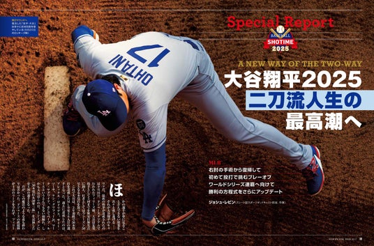 大谷翔平選手の所属するロサンゼルス・ドジャースのプレーオフが始まります。今年3月に東京ドームの開幕戦を見た時は、「このまま1敗もせず連覇するのでは」と思えたほど戦力充実のドジャースでしたが、夏以降はけが人続出で苦戦続き。その中でも、ひときわ輝きを放っていたのが大谷選手でした。二刀流復帰のシーズンで負担が増す中、今年も本塁打王を争い、「あと1人でノーヒット・ノーラン」の山本由伸投手と共に苦しむチームを牽引しました。MLBを代表する大スター・大谷選手の二刀流復活をアメリカはどう見たか。9月30日発売号の特集「大谷翔平の2025年 二刀流の奇跡」で詳しく紹介しています。日本人番記者が明かす大谷取材の舞台裏や、ロバーツ監督独占インタビューもお読みください。(長岡)