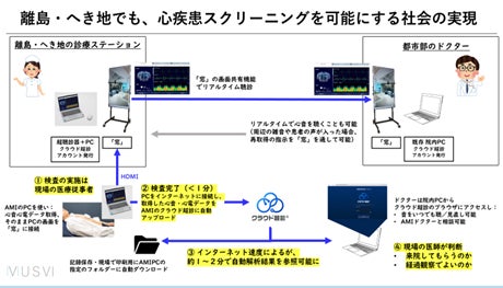 本協業により、AMI社が開発するAI搭載型デジタル聴診器『超聴診器※(遠隔医療支援システム「クラウド超診(R)」)』と、MUSVIが提供するテレプレゼンスシステム「窓」(以下「窓」)を組み合わせることで、離島やへき地など専門医が不在の地域においても、都市部の専門医による遠隔聴診・心疾患スクリーニングを可能とする新たな遠隔医療の体制を構築・提案いたします。