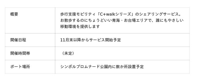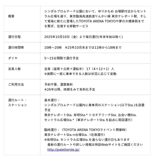 本事業では、臨海副都心エリアの各事業者と連携しながら、モビリティの力でエリア全体の回遊性を高めることで、まち全体を活性化させることを目的に「PALETTE RIDE」をはじめ、
