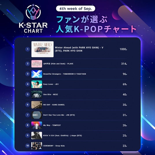 『K-STAR CHART presents POP-K TOP10 Friday』週間チャート1位は、BTSのVとパク・ヒョシンによる「Winter Ahead (with PARK HYO SHIN)」となり、番組内でもオンエアされました。