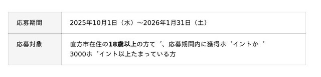 2025年10月1日(水)~2026年1月31日(土)の期間中に、獲得ポイントを3000ポイント貯めると豪華賞品が当たる抽選へ応募できます。賞品には健康家電や美容家電のほか直方市の魅力が詰まった特産品詰め合わせなどをご用意します。