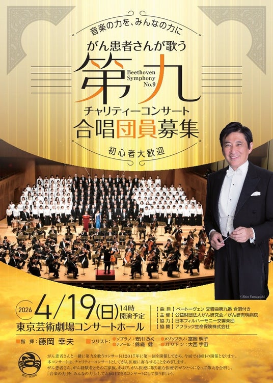 公益財団法人がん研究会・がん研有明病院は、がん患者さんと共にベートーヴェンの「第九」を歌うコンサートを開催いたします。本コンサートは藤岡幸夫氏指揮、公益財団法人日本フィルハーモニー交響楽団の演奏のもと、がん患者さんやサバイバーとその家族、そして医療者200名が「がん克服」に向けて想いをひとつにして「第九」を合唱することで、がん患者さんはもとより、様々な困難に直面する方々を勇気づけることを目的に開催するものです。