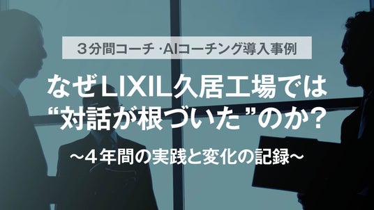 住まいの水回り製品と建材製品を開発、提供するグローバル企業・LIXILでは、2021年に全社的な組織変革「変わらないとLIXIL」に着手しました。その中で、ハウジングテクノロジー事業中部統括工場のメイン工場である久居工場では、人事戦略に「後発組から業界トップになった文化を誇りに新時代に適応する主体化集団への転換」を掲げ、コーチ・エィが提供する対話型組織開発ソリューション「3分間コーチ」を2021年から導入しています。さらに2024年からAIコーチング「CoachAmit」の活用も開始しています。今回公開する対談レポートでは、組織文化変容に向けたコーチング導入の提案者でもある同社久居工場工場長 長嶋伸明氏と、プライベートでもコーチングを学ぶ同社久居工場総務課長 大塚真人氏をお招きし、導入に至った経緯や導入後に生まれた変化についてお話を伺いました。
