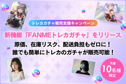 クリエイターDXカンパニーである株式会社TORIHADA(本社:東京都渋谷区、代表取締役社長:若井 映亮)が開発するクリエイターコンテンツ販売サービス「FANME(ファンミー)」は、クリエイターのファンエンゲージメントを高める新機能「トレカガチャ」をリリースしました。また、新機能リリースを記念し、トレカの出品から印刷、発送までをFANMEが全面サポートする限定キャンペーンも開催します。