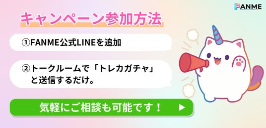 FANME公式LINEを友達追加し、トークルームで「トレカガチャ」と送信してください。
