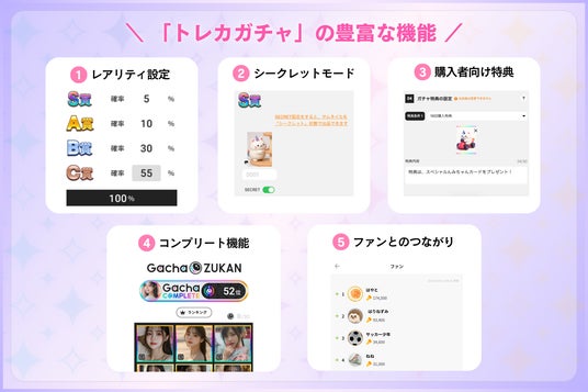 トレカガチャは、クリエイターが作成したデジタル画像をトレーディングカードとして販売できる新機能です。ガチャ形式で提供することで、ファンはどのカードが出るかわからない「ドキドキ感」と、コンプリートを目指す「コレクションの楽しさ」を体験できます。
