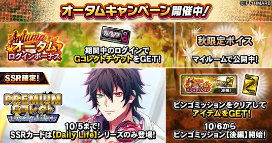 期間中、ビンゴミッションやログインボーナスを開催しているほか、マイルームでは「秋」に関するボイスを公開中です。