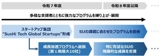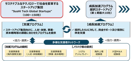 本事業では、所定の要件を満たし、推薦者からの推薦を基に外部有識者が認定したスタートアップで構成される“SusHi Tech Global Startups”に対して、官民を挙げて全方位からの支援を行います。