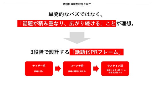 一過性のバズで終わらせないために、キャンペーンをティザー期/ローンチ期/サステイン期の3フェーズで設計し、長期的な話題化とブランド接触の最大化を目指します。