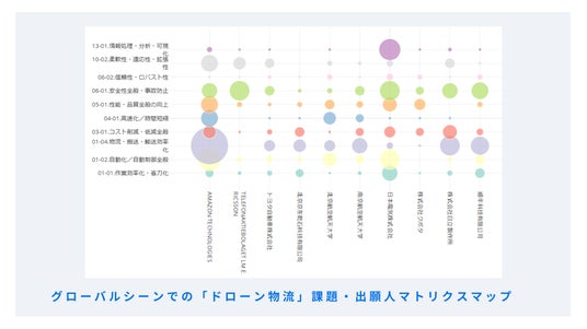 海外特許に付与された日本語の分類ラベル(用途・課題ラベル)を使用して、グローバルで横断した用途・課題マッピングが可能になります。