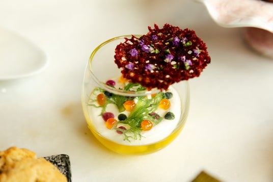 ・帆立⾙のナージュ 海藻といくらのクリーム 紫蘇のエッセンス 花穂と真紅のチュイル