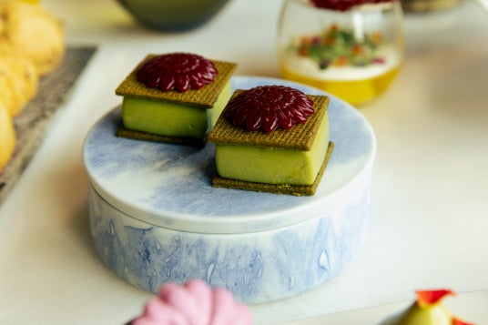 そしてこの度、第一弾として独自の筒描染の技法を用いた⾊彩豊かな作品で注目を集める若手アーティスト なかむら ずい氏とのコラボレーションを行います。アートとスイーツとの共演を皆様にお楽しみいただきたいと考える中で、なかむら氏が用いる技法、筒描染のペーストを絞りながら着彩していく様子が、ホテルのペストリーシェフがホイップを絞り出す様子と類似していたことから、アフタヌーンティーを味わいながらアートも楽しんでいただけるきっかけになるのではと今回のコラボレーションが決定しました。