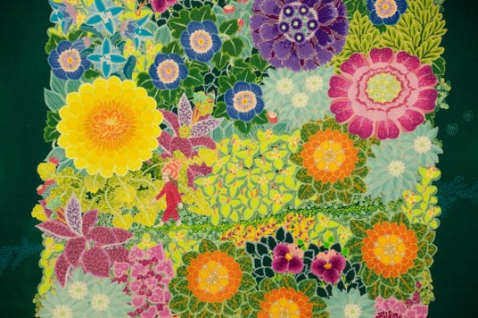 なかむら氏は、工程のほぼ全てを⾊糊(⾊⽷目・写し友禅)を用いた筒描きのみで制作している。