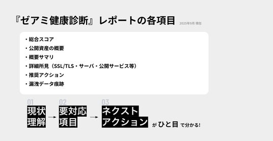 『ゼアミ健康診断』は、企業のセキュリティ状態を分析し、100点満点でセキュリティ状態をスコア化するサービスです。経営層でも一目で理解できる総合スコアと、実務担当者が即行動に移せる「推奨アクションリスト」を提示。さらに、改善後の再診断や取引先の診断にも対応し、継続的なコンサルティングを通じて企業のセキュリティ強化を支援します。