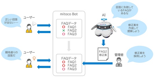 管理者は管理画面に一覧表示された提案内容を確認し、ボタン操作一つでFAQデータに反映させることができます。