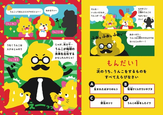 本冊子は、「うんこ」を切り口に、食べ物と環境の深いつながりを学べる一冊です。物語は「うんこ先生」「うんこねこ」「うんこいぬ」が登場し、会話形式のストーリーとクイズを交えながら進んでいきます。たとえば「うんこをするのは人間だけか?」「家畜のうんこが地球にどんな影響を与えるのか?」といった問いかけを通じて、子どもたちの興味を自然に引き出します。