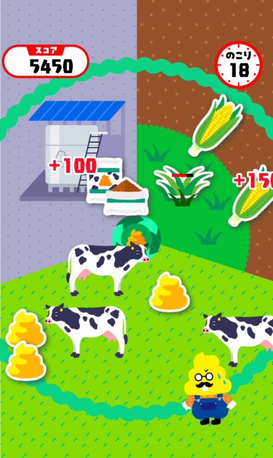肥料を畑に運んで牧草やとうもろこしを育て、その作物を牛に与えると牛乳をつくり、再びうんこが出る、というサイクルを繰り返すことでスコアが加算されます。遊び終えた後にも「楽しかった」だけでなく「環境や食とつながっている」という実感が残る設計になっています。