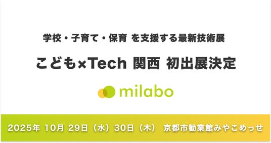 自治体向けサービスを開発する株式会社ミラボ(本社:東京都千代田区、代表取締役:谷川一也、以下「ミラボ」)は、2025年10月29日(水)~30日(木)京都市勧業館みやこめっせ で開催される「こども×Tech 関西」に初出展することが決定しました。