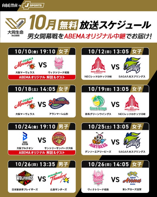 「ABEMA」では、国内トップ選手と世界のスターが集う『2025-26 大同生命SV.LEAGUE』を「ABEMA de J SPORTS」にて無料生中継。注目カードが並ぶ開幕節から、毎節厳選された試合をお届けします。ハイライト配信も含めて、世界最高峰を目指す新リーグの熱戦をぜひ「ABEMA de J SPORTS」でお楽しみください。