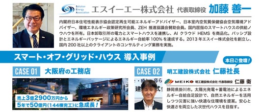 本セミナーでは、エスイーエー株式会社の加藤社長より「スマート・オフ・グリッド・ハウス戦略」についてお話しいただきます。さらに工務店による実際の取り組みとして、明工建設株式会社の仁藤社長より導入事例をご紹介いただきます。