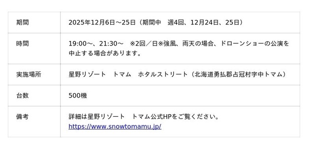 その第一弾として、2025年12月6日(土)よりクリスマスをテーマにしたドローンショーを開始し、広大なトマムの夜空を彩ります。ショーには、トマムを象徴するランドマーク「トマム ザ・タワー」、敷地内にあるファームエリアで飼育されている牛や北海道の形など、この地ならではのモチーフが登場。さらにサンタクロースやクリスマスを象徴するデザインを、ドローンの光で鮮やかに表現します。冬の澄んだ夜空に浮かび上がる光のアートで、忘れられない感動体験を提供します。