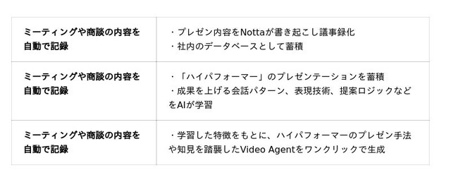 今回のパートナーシップにより、Video Agentは業務自動化ツールから、ハイパフォーマーを自動複製し、企業力を加速させるためのAIパートナーへと進化します。notta社との共同開発を通じて、知識とスキルの再現性を飛躍的に高め、企業の成長ドライバーとなる新たなソリューションを提供してまいります。