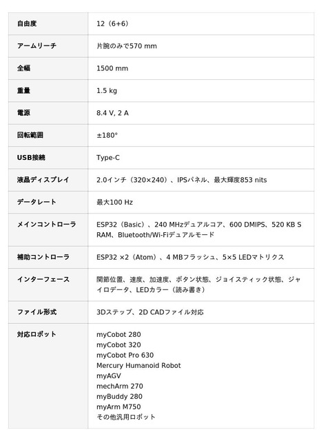 myCobot 280(M5 / Pi)、myCobot 320(M5 / Pi)、myAGV(Pi / Jetson)、mechArm 270(M5 / Pi)、myArm M750、Mercury A1、Mercury B1等で使用でき、本製品と連携した開発やデータ収集、遠隔操作が可能です。