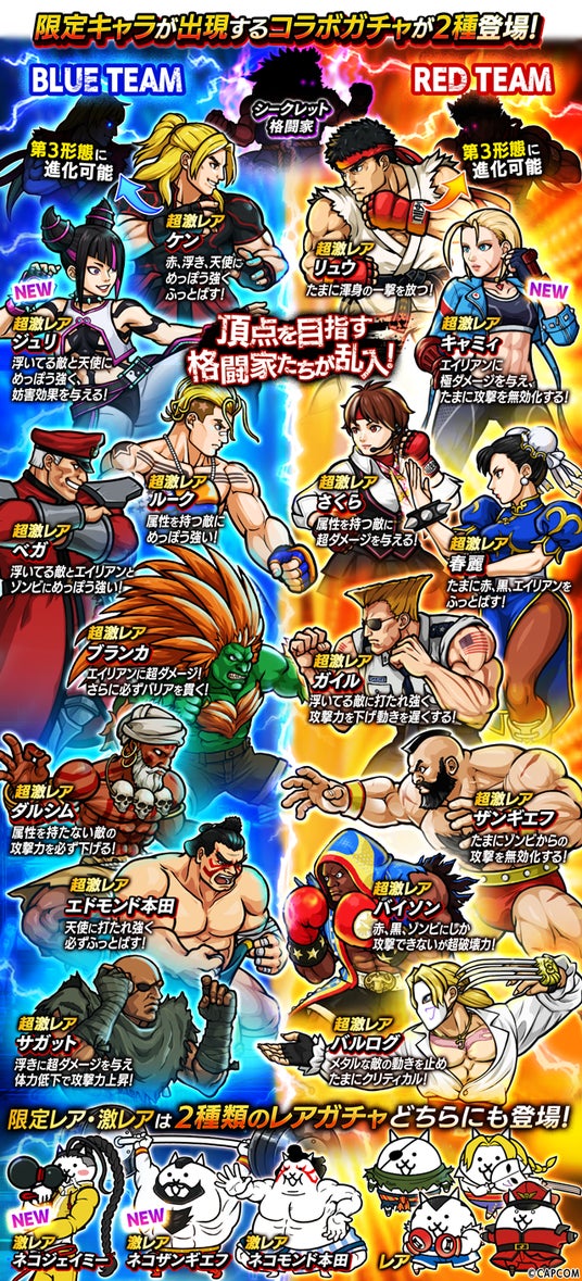 コラボ限定キャラクターが出現する「ストリートファイター6」ガチャをBLUE TEAM、RED TEAMの2種類に分けて開催いたします。