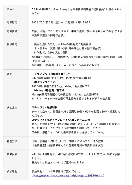 国内外から33作品の応募を集めた業界初(※1)の動画生成AIコンテストの成功を受け、第2回『AGRI VISION for Gen Z ~もし、あなたが未来農業戦略室 "初代室長" だったら?~』を2025年10月10日(金)より開催します。